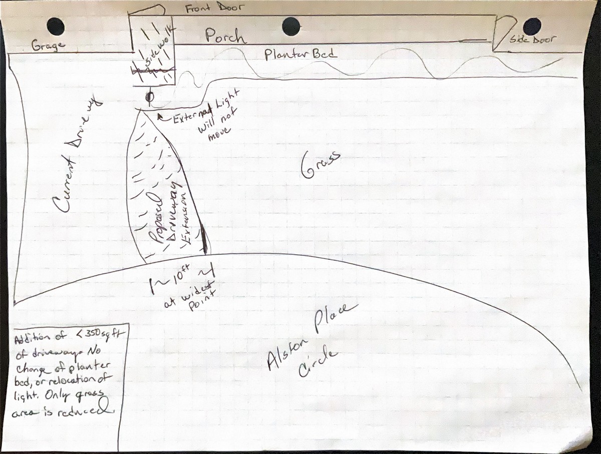 | Comments | Requesting a driveway expansion of less then 350sq ft. Proposed expansion will occur into the lot, not toward any other lots. It will involve reduction of grass area only, no reduction of planter beds. |